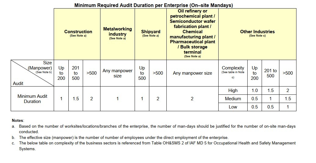 The minimum time for conducting an audit will be determined in compliance to the requirements stipulated in below table as per Annex 2 to Appendix 1 of CT 17.